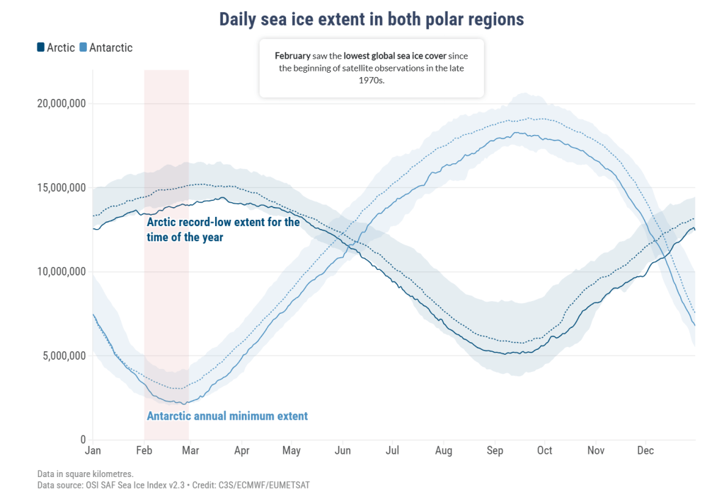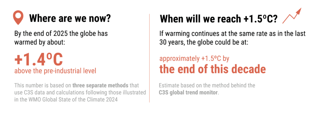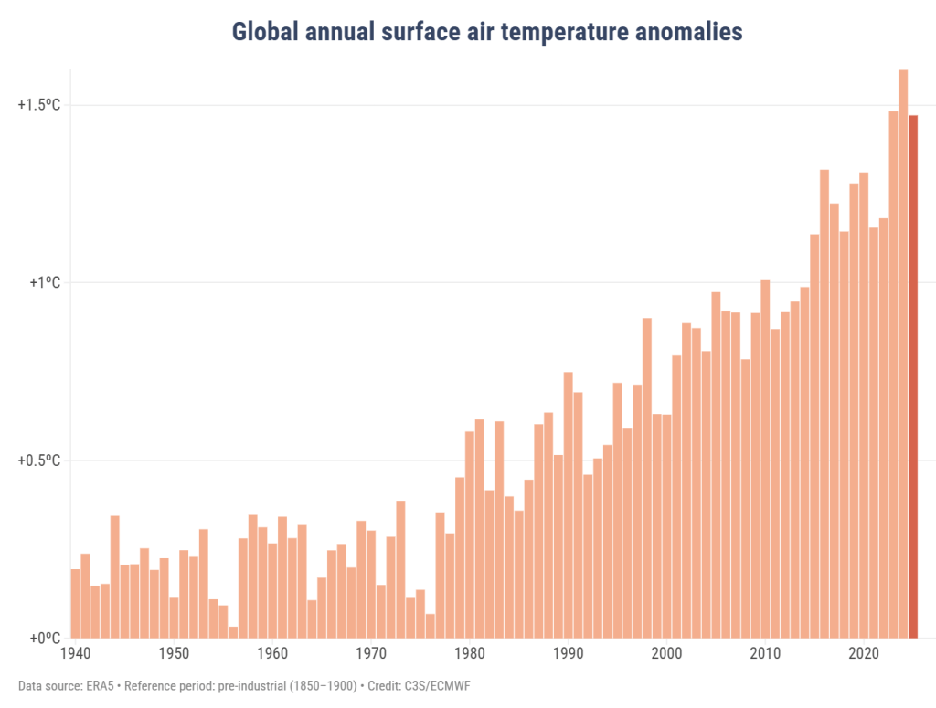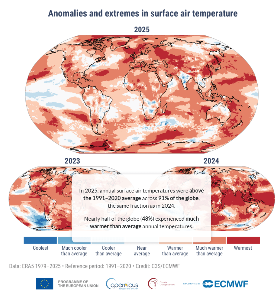 The European Union’s Copernicus Earth Observation Program released a few charts summarizing temperatures in 2025.