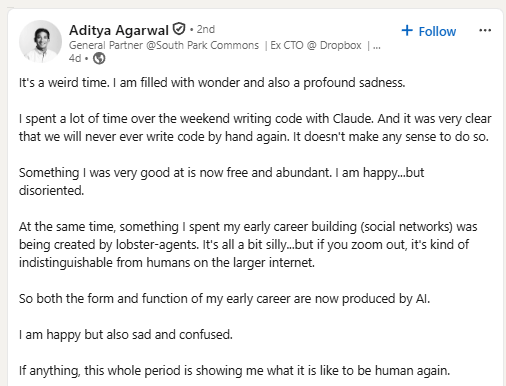 Aditya Agarwal, former Dropbox CTO and early engineer at Facebook, shared his emotions after using Claude Code over a weekend in a thoughtful post.