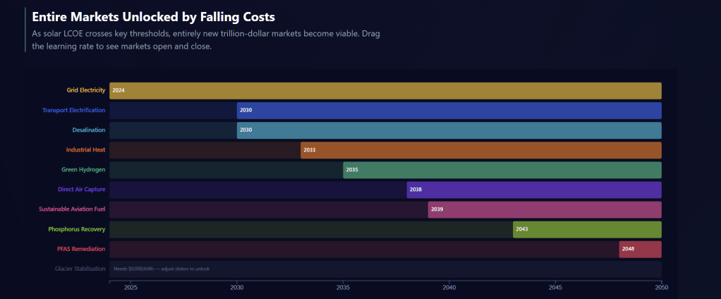 It is fascinating to think about the impact of lower costs. Suddenly, technologies that were out of reach given how energy expensive they were – from desalination to sustainable aviation fuel – become possible.