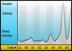 I found the Sleep Cycle Alarm clock, bought it for $0.99 and began using it. The concept is simple – you place the iPhone at the edge of your bed, it records your body movements and calibrates the depth of your sleep. So, a normal night of sleep looks like this –