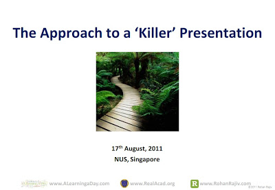 I was at my alma mater, NUS i.e. National University of Singapore last wednesday for a workshop on ‘Killer Presentations’ organized by the NUS Career Centre. We had a good response (60 out of the 100 registrants showed up which fits with the usual 60% response expectation I generally have with all free workshops).