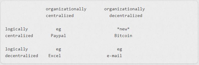 The “organizationally centralized” column on the left contains systems that are controlled by a single organization (EBay and Microsoft in the examples, but this doesn’t need to be a corporation, it could also be a government). Conversely the “organizationally decentralized” column on the right contains systems that are not under the control of any one entity whether for profit or otherwise.