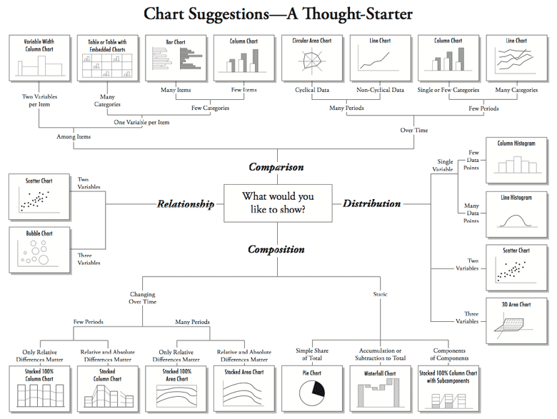 With more data present than ever before, understanding how to visualize data is a useful skill. To that end, I thought I’d share a “chart suggestions thought starter” infographic. Most of it is common sense.