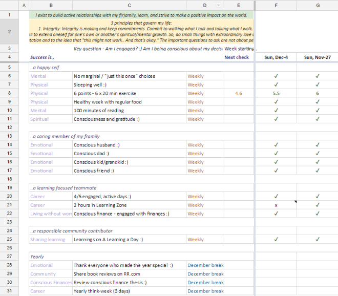 Learning 5 – It helps, at first, to make these actionable and check in on these from time to time. I started with daily checks, then a long list of weekly checks combined with a log of how I spent my week. This, then, become a shorter list of checks that took 5-7 minutes every weekend. As of last month, it is a much shorter list (shared below) that takes a couple of minutes. I expect to have no such checks in a few years. But, for now, I find it helpful to check in with myself every weekend to build my instincts as they generally suck at first.