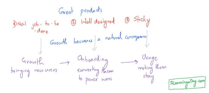 These characteristics, in turn, helps them grow. There are many ways to think about this cycle of growth. Acquire -> Activate -> Retain -> Monetize -> Refer is one way to do it, for example. But, I’ll aim to simplify again and just focus on the following cycle of 1) Growth (the act of bringing new users into a product) -> 2) Onboarding (the act of converting new users to power users) -> 3) Usage (the act of retaining power users)