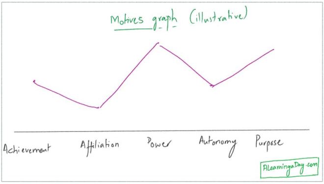 If we had to go with a “High,” “Medium,” “Low” ranking, I would likely be – High on Power and Purpose, Medium on Achievement and Autonomy and Low on Affiliation. So, my motives graph would look something like this –