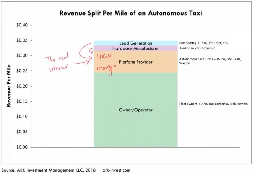 While traditional car companies are focused on staying relevant in the era of the electric car, the end-game is likely going to be all about ensuring survival in the age of the autonomous vehicle. Here, it helps to take apart a useful speculative analysis by Ark Invest on the revenue per mile from autonomous cars. They predict the following –