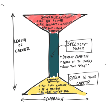 As Khe’s illustration demonstrates, there’s a lot to be gained from exploration early in the career as it helps us figure out what we’d like to be good at. Then, we invest in becoming specialists. And, finally, if we’re interested and able, we get to zoom out again as executives who oversee multiple specialist areas.