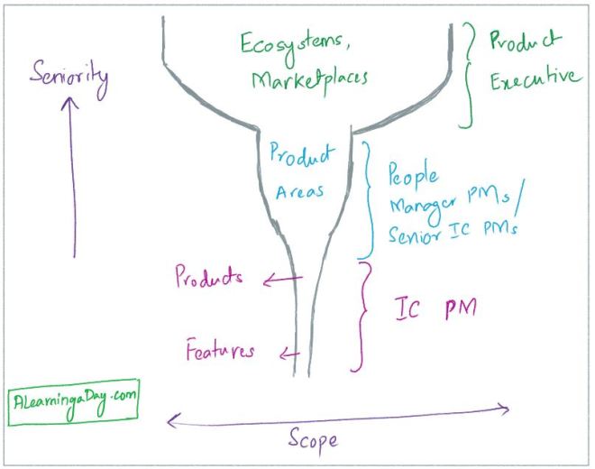 Individual contributor/IC PMs start with a focus on narrow features and small products. Over time, they take on larger products and product areas. Larger product areas are typically led by people managers (“Group”) or senior ICs (“Principal,” “Staff”). And, product executive teams typically oversee entire marketplaces and ecosystems.