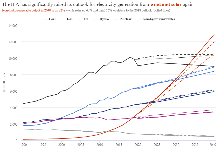 (3) This year’s version of the highly influential annual outlook offers four “pathways” to 2040, all of which see a major rise in renewables. The IEA’s main scenario has 43% more solar output by 2040 than it expected in 2018, partly due to detailed new analysis showing that solar power is 20-50% cheaper than thought.