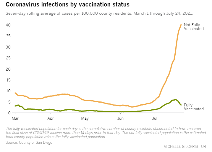 (5) The Delta disaster, sadly, is a crisis affecting the unvaccinated. I thought this San Diego Daily Tribune’s chart was simple and effective. We need more of these sorts of visualizations.