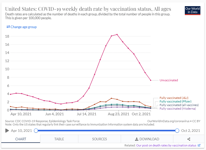 Once we have that out of the way, we can now look at how the stats have trended. Vaccine performance has been similar to trials – J&J has a higher death rate than the Pfizer/Moderna vaccine. And, the vaccines – on average – reduce the mortality rate between 400%-800%.