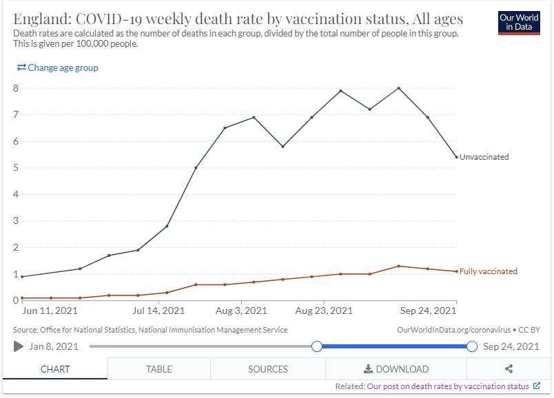 It is fascinating to see an even higher delta between the vaccinated and the unvaccinated in the UK. This is a combination of the Pfizer and the Oxford-AstraZeneca vaccine. I wonder if it is driven by more severe waves driven by a more urban population.