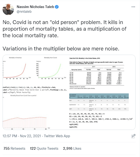 If you do enjoy a more complex data visualization, Nassim Taleb had a good one. He explained that COVID isn’t an old person problem. It just acts as a multiplier on existing mortality rates. It is just that the mortality rate for older folks is higher by default.