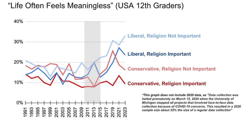 Jonathan Haidt unearthed a fascinating insight among 12th graders – finding that conservatism and religion helped reduce the impact of this dislocation.
