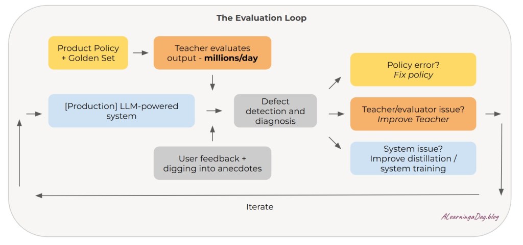 In the last post, I wrote about teacher models giving us painful self-awareness – you can evaluate millions of outputs and know what’s broken at scale. The eval loop is what you DO with that awareness: a continuous diagnostic and improvement system that makes LLM-powered products actually improvable.