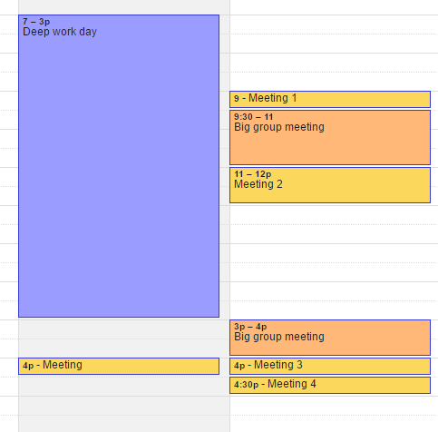 3. Protect your deep work days. As time passes, begin putting in blocks on your deep work days so no one schedules meetings.